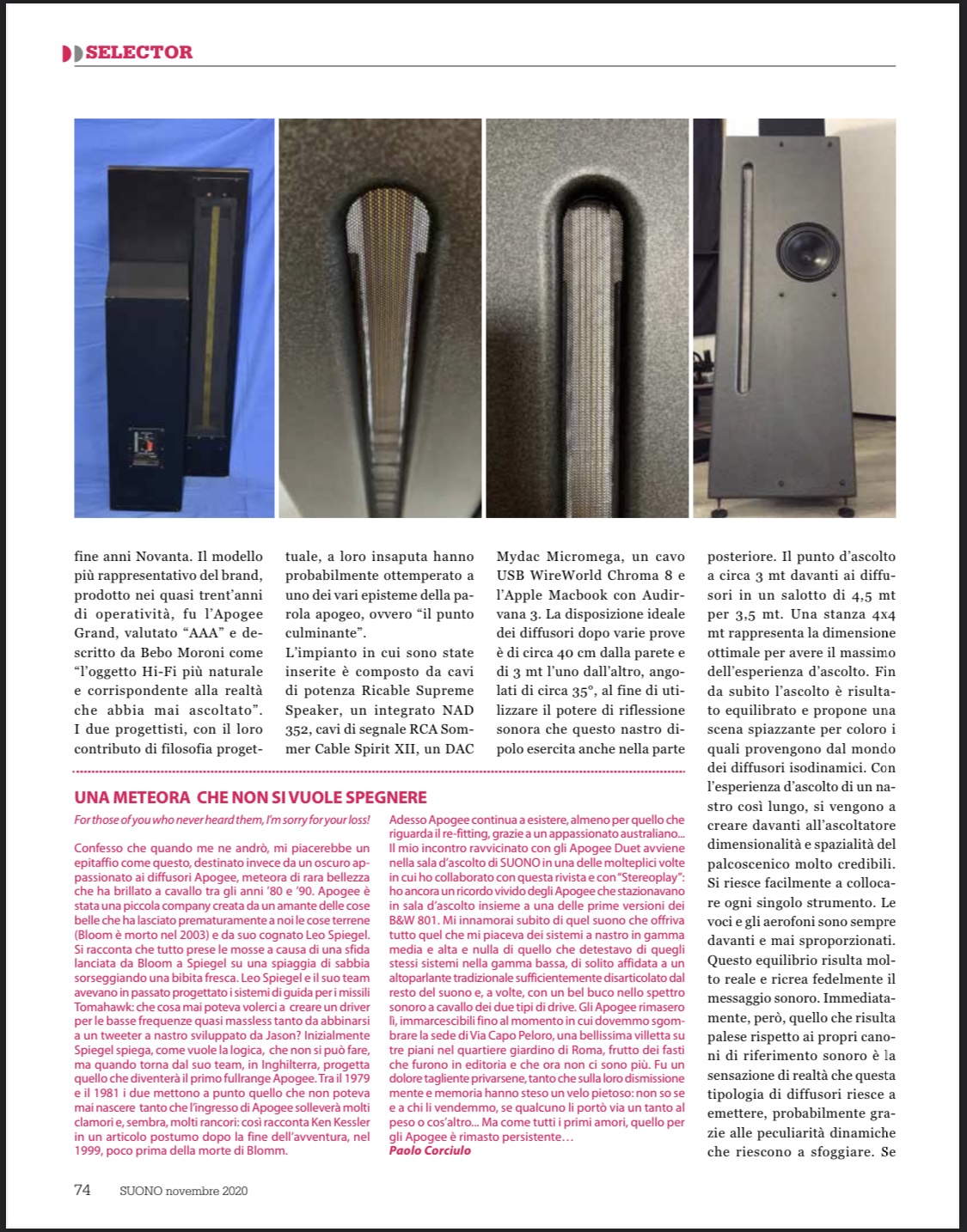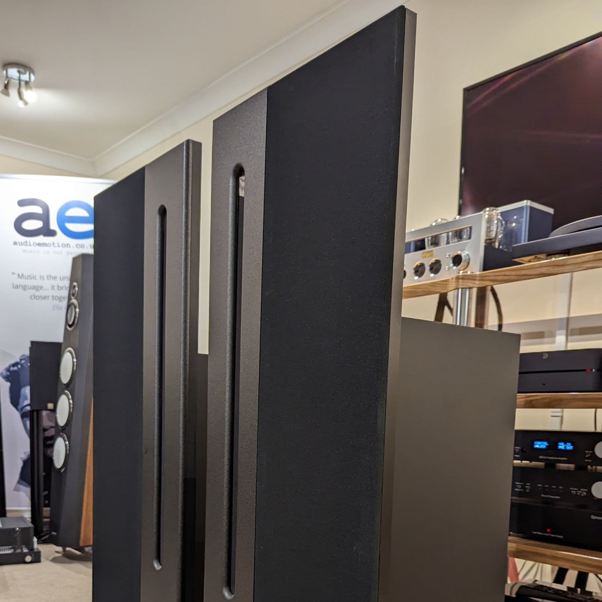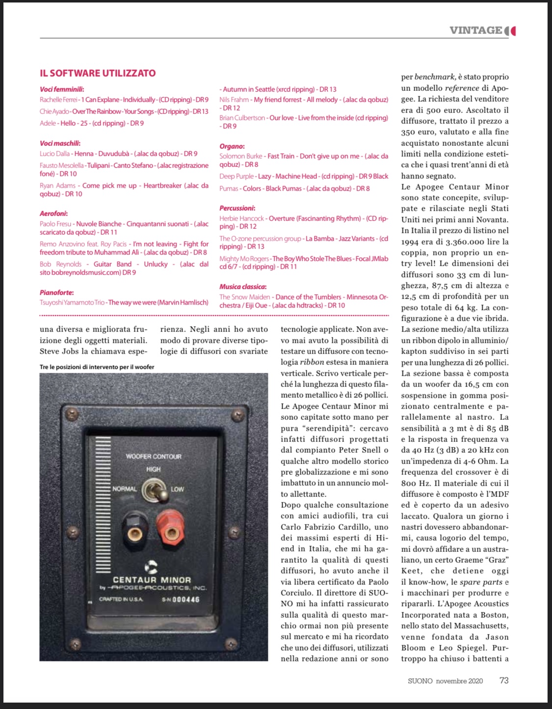 Questa casse sono un po' ostiche in termini di posizionamento e pilotaggio, ma una volta raggiunto un equilibrio sono un pianeta diverso rispetto a dei diffusori dinamici classici: velocità nei transienti incredibile, che rende molto realistico il messaggio sonoro. Una grande fetta di segnale è riprodotto dallo nastro rendendo coerenti le note e le loro armoniche, nessun crossover, nessuna rotazione di fase. Non hanno nessuna timbrica specifica per questo le voci sono semplicemente naturali, mai aspre oltre al messaggio racchiuso nella registrazione, palcoscenico di una tridimensionalità incredibile che va oltre le pareti di fondo, il soffitto e i muri perimetrali.