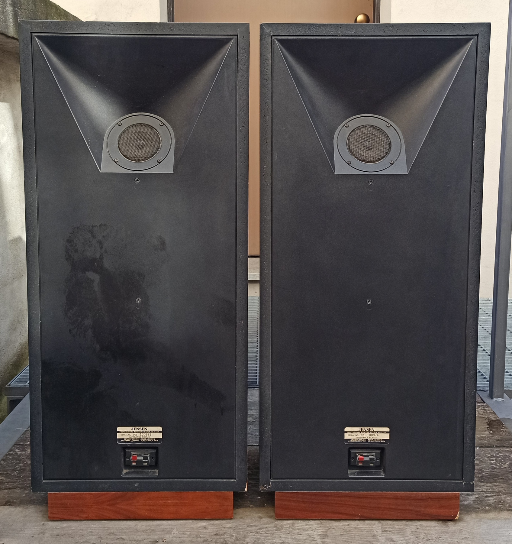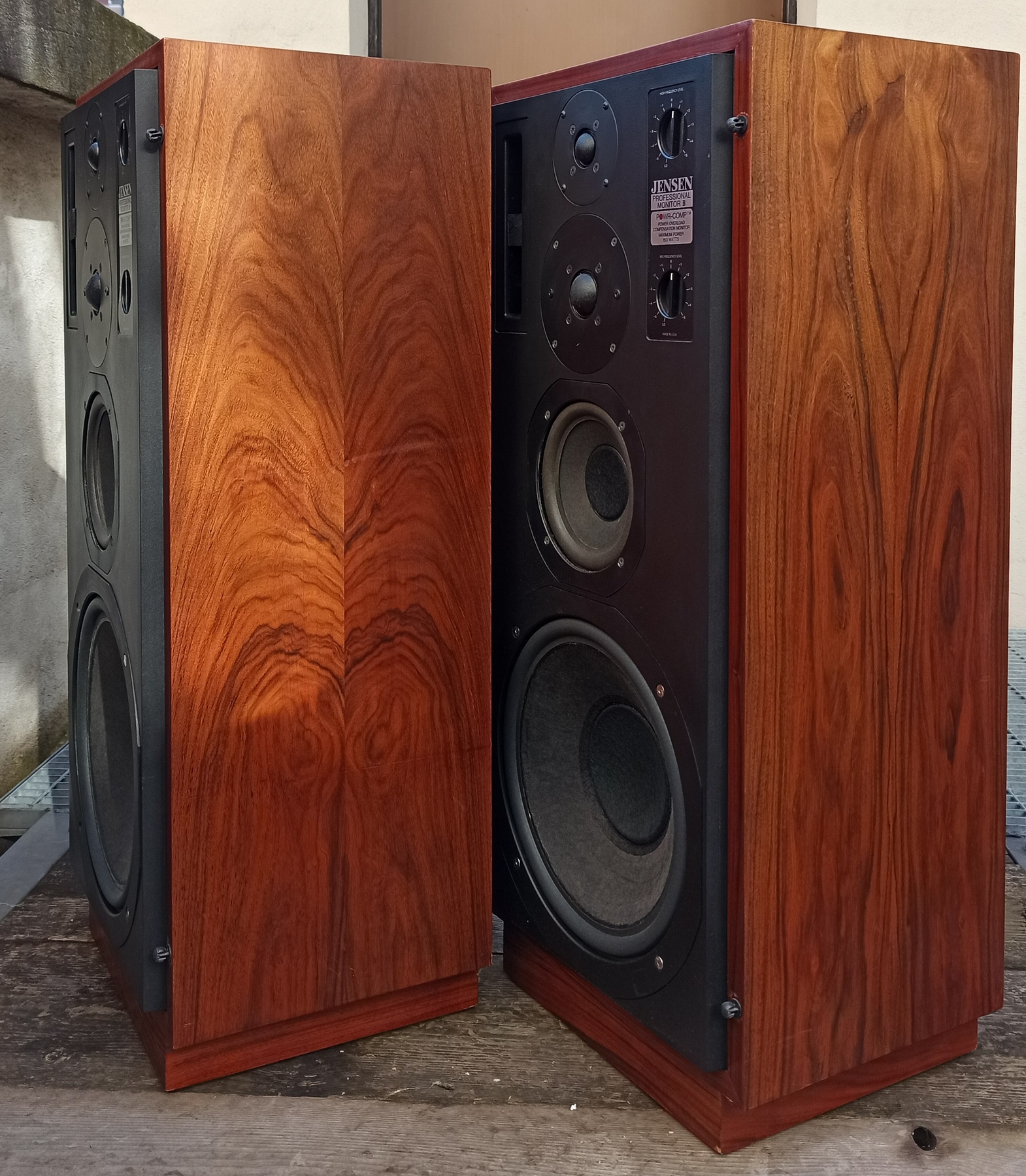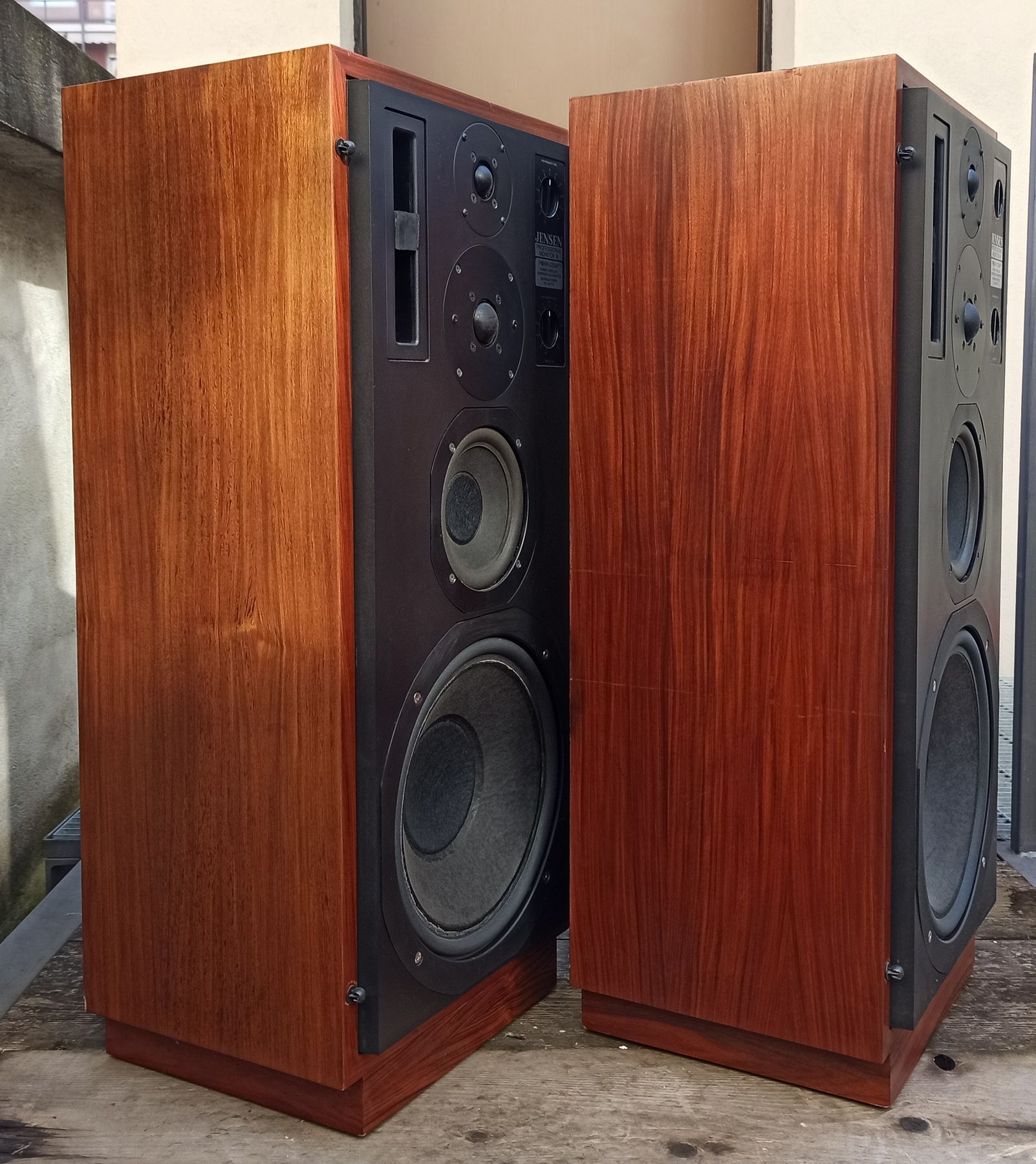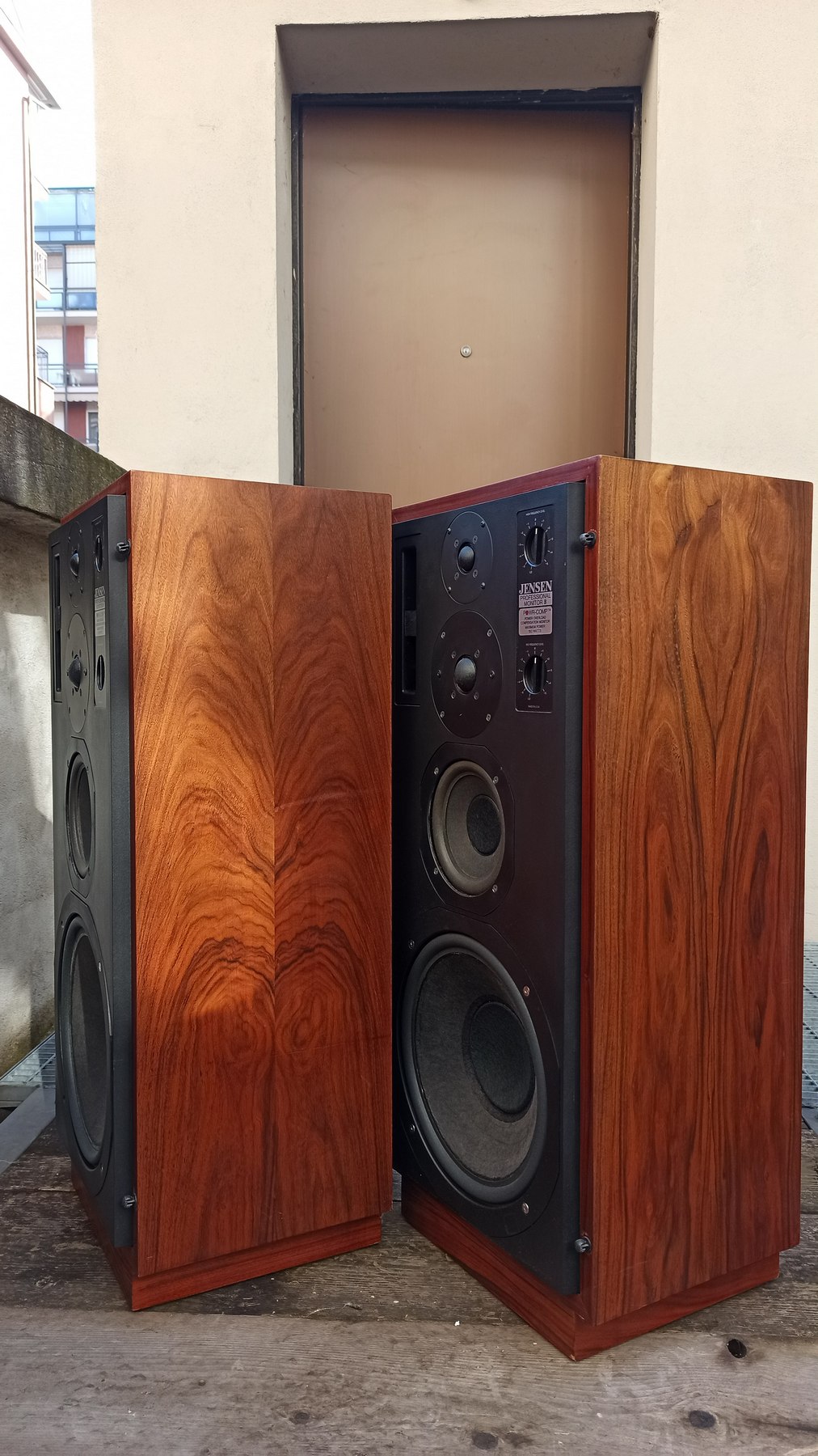 Diffusori estremamente rari della Jensen, marchio americano importante. A loro si deve l'invenzione dei diffusori dinamici. Questo è il loro canto del cigno. Si tratta dell'ultimo grande progetto concretizzato in casa jensen. Sono una coppia di diffusori a 5 vie con selezione ricercata dei componenti. Tra cui lo stesso tweeter audax usato nei monitor inglesu BBC 5/8. Audax è un produttore francese e questo racconta quanto fossero ricercati i componenti perchè un team di progetto americano facesse arrivare da oltreoceano i componenti. Presentano un tweeter posteriore per l'ambienza con un taglilo più ampio e 4 altoparlanti anteriori, un design ricercato. Il suono non è vintage ma moderno, raffinato ed estremamente dettagliato come ci si potrebbe aspettare da uno studio monitor. Il basso è profondo e implementato in bass reflex ma controllato e corretto. Ora scriverò una parola che non mi piace negli annunci ma questa volta è vero, rari, anzi rarissimi. Ho parlato con l'importatore che mi ha riferito in Italia ne sono state importate 9 coppie. Nelle foto del produttore la cassa era montato su un supporto a forma di "U" rovesciata che permetteva di regolare l'angolazione in due o tre posizioni. Erano molto costosi da produrre. Furono realizzate tra il 1980 e il 1981.