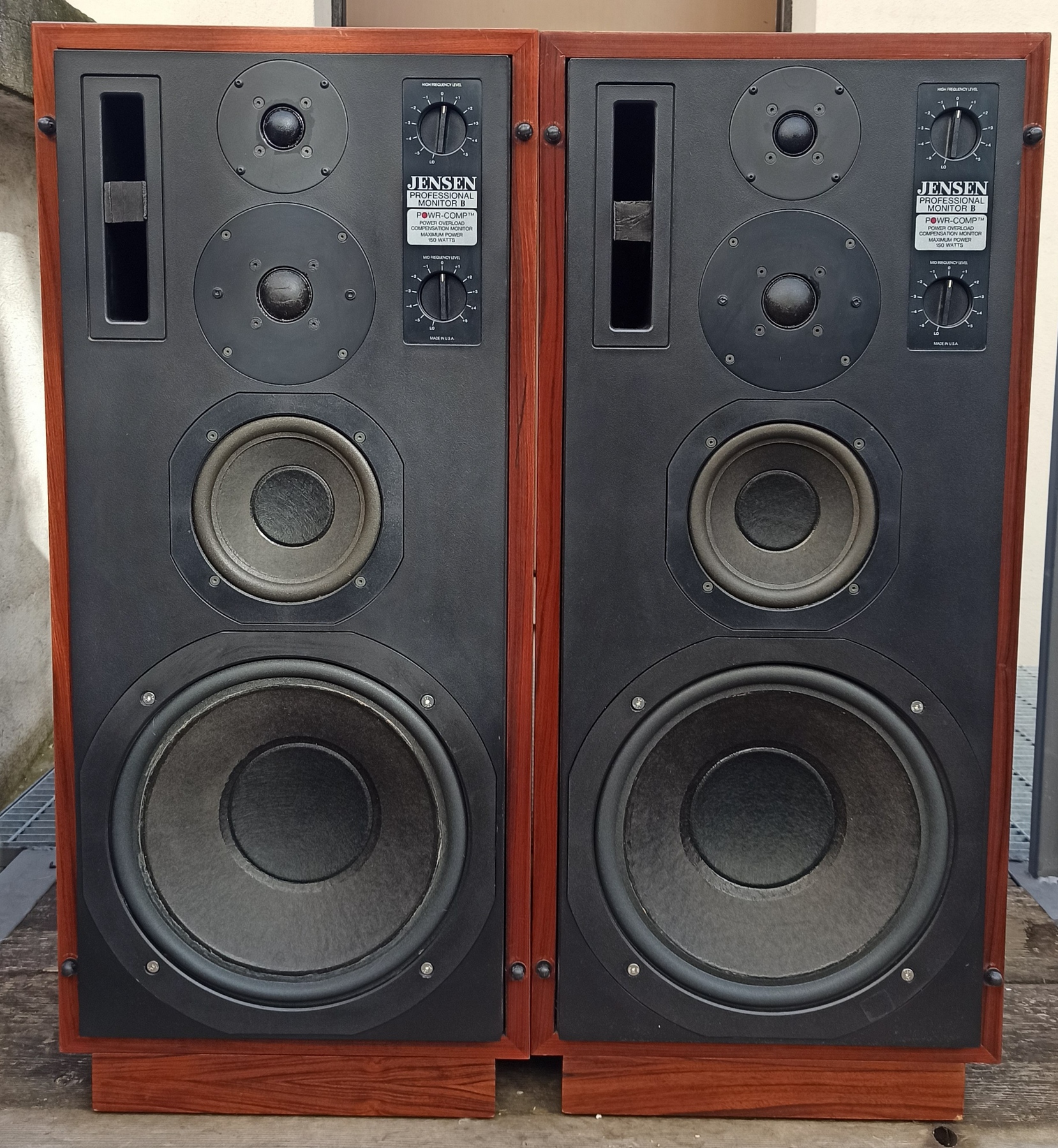 Diffusori estremamente rari della Jensen, marchio americano importante. A loro si deve l'invenzione dei diffusori dinamici. Questo è il loro canto del cigno. Si tratta dell'ultimo grande progetto concretizzato in casa jensen. Sono una coppia di diffusori a 5 vie con selezione ricercata dei componenti. Tra cui lo stesso tweeter audax usato nei monitor inglesu BBC 5/8. Audax è un produttore francese e questo racconta quanto fossero ricercati i componenti perchè un team di progetto americano facesse arrivare da oltreoceano i componenti. Presentano un tweeter posteriore per l'ambienza con un taglilo più ampio e 4 altoparlanti anteriori, un design ricercato. Il suono non è vintage ma moderno, raffinato ed estremamente dettagliato come ci si potrebbe aspettare da uno studio monitor. Il basso è profondo e implementato in bass reflex ma controllato e corretto. Ora scriverò una parola che non mi piace negli annunci ma questa volta è vero, rari, anzi rarissimi. Ho parlato con l'importatore che mi ha riferito in Italia ne sono state importate 9 coppie. Nelle foto del produttore la cassa era montato su un supporto a forma di "U" rovesciata che permetteva di regolare l'angolazione in due o tre posizioni. Erano molto costosi da produrre. Furono realizzate tra il 1980 e il 1981.